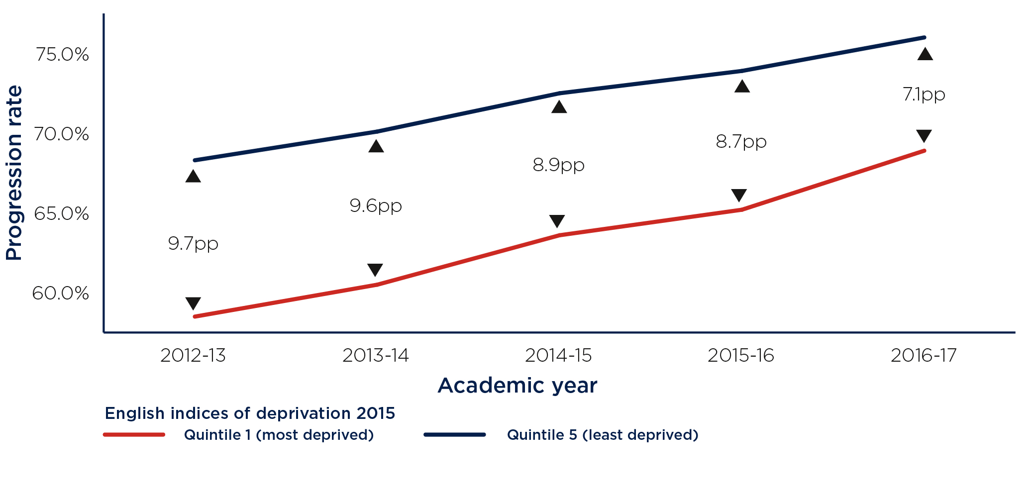 - In 2015-16, 65.2 percent of graduates from the most deprived quintile were employed in a highly skilled job compared to 73.9 from the least deprived, a percentage point gap of 8.7.