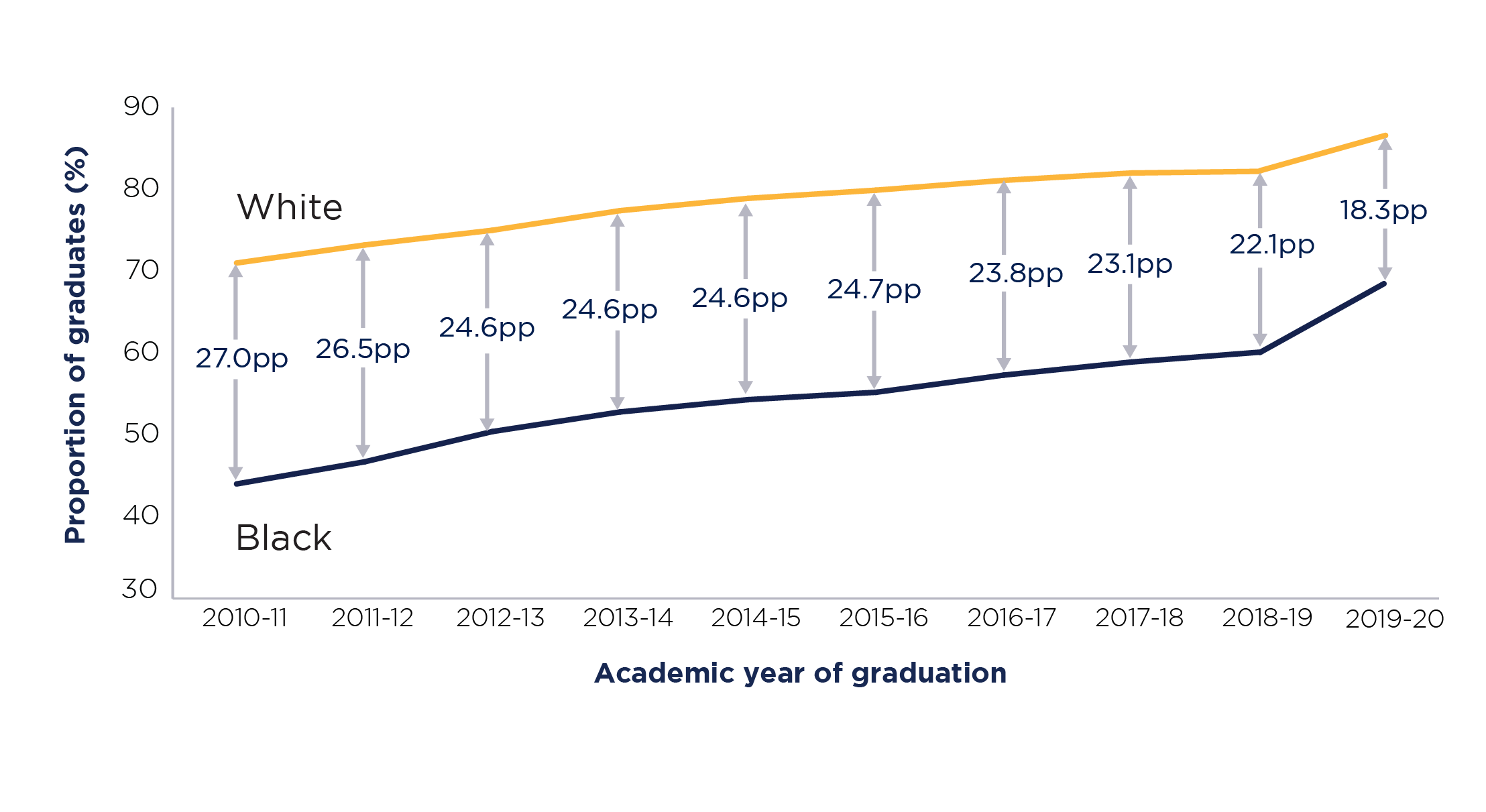 - In 2019-20, 68.2 per cent of black students and 86.6 per cent of white students received 1sts and 2:1s, a difference of 18.3 percentage points.