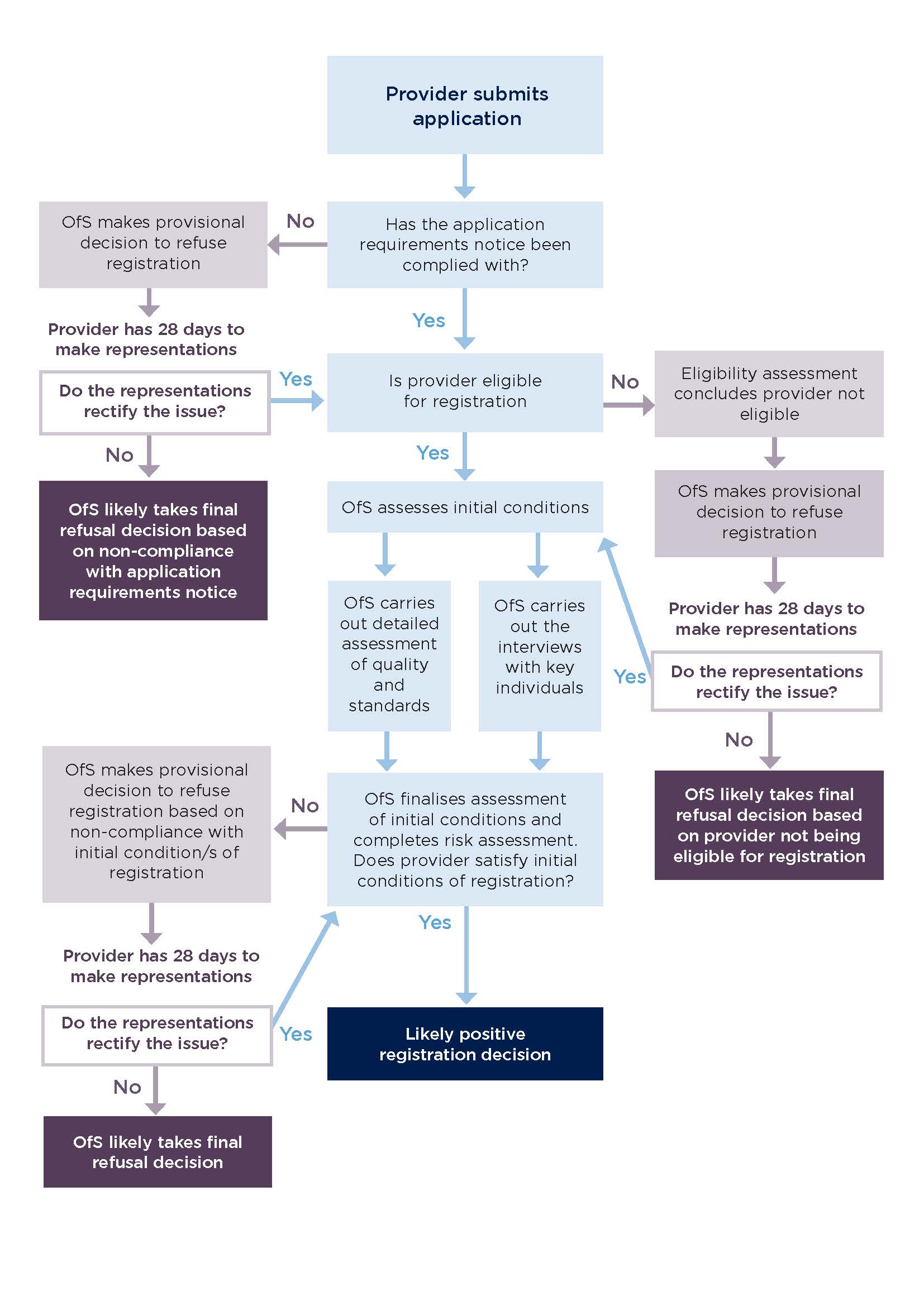 - The main steps in the assessment process are shown below. This includes the steps relevant if we take a provisional decision to refuse an application. This diagram is illustrative in nature and is based on a straightforward registration application and therefore your provider's application may not strictly adhere to this journey.