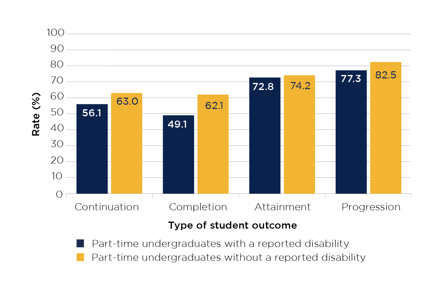 The continuation rate for part-time undergraduates with a reported disability is 56.1 per cent and for part-time undergraduates without a reported disability is 63.0 per cent.